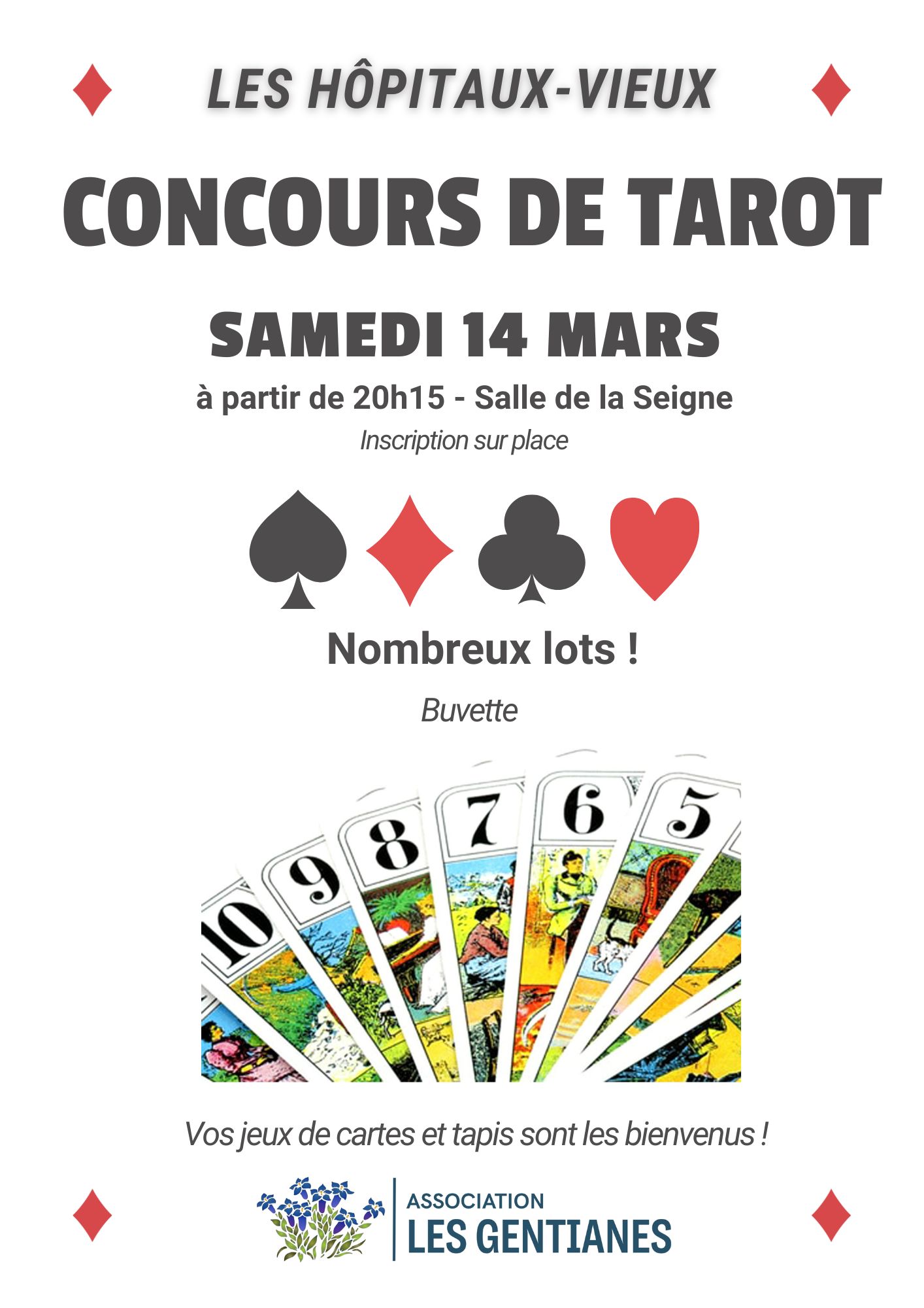 L’association Les Gentianes organise un concours de tarot samedi 14 mars à partir de 20h15, à la salle de la Seigne aux Hôpitaux-Vieux. Inscriptions sur place, nombreux lots à gagner et buvette disponible. Les joueurs peuvent apporter leurs cartes et tapis. Un rendez-vous convivial ouvert à tous les amateurs de tarot.