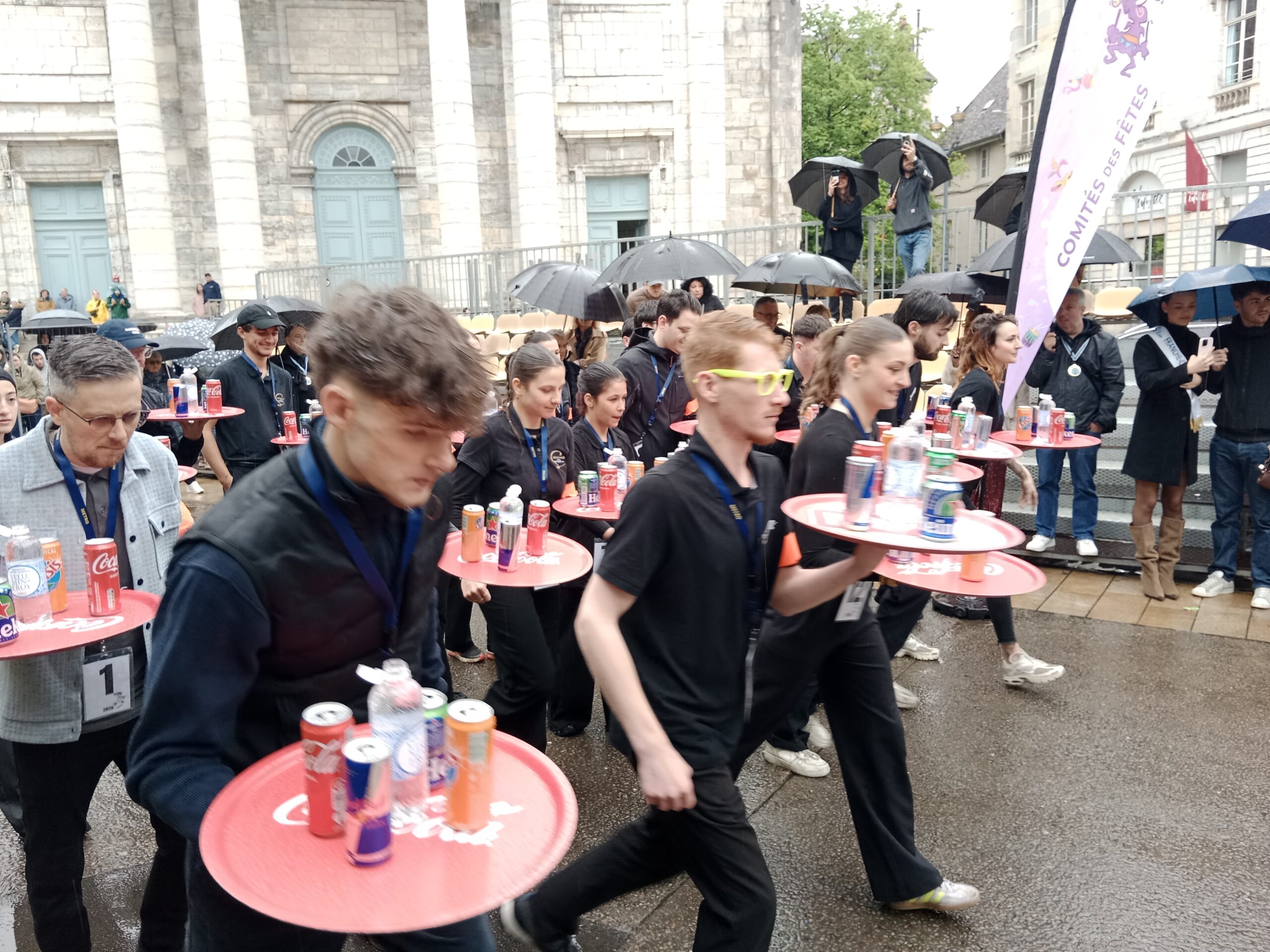 La traditionnelle course des filles et garçons de café s’est déroulée en bonne et due forme. Ils étaient 24 participants cette année. Le circuit menait de la Place du Huit Septembre à la Place Victor Hugo puis retour par la rue des Granges et l’arrivée Place du Huit. Porter un plateau chargé de canettes, d’une bouteille d’eau et d’un verre n’est pas chose aisée…mais ils ont l’habitude ! Adrien Broch du Madigan’s est monté sur la première marche du podium, comme l’an passé. Il était suivi par Julien Brischoux de l’Iguane Café et Nicolas Musy du Gotham. Côté filles, c’est Juliette Bertin du restaurant Le Sauvage qui a emporté le trophée.