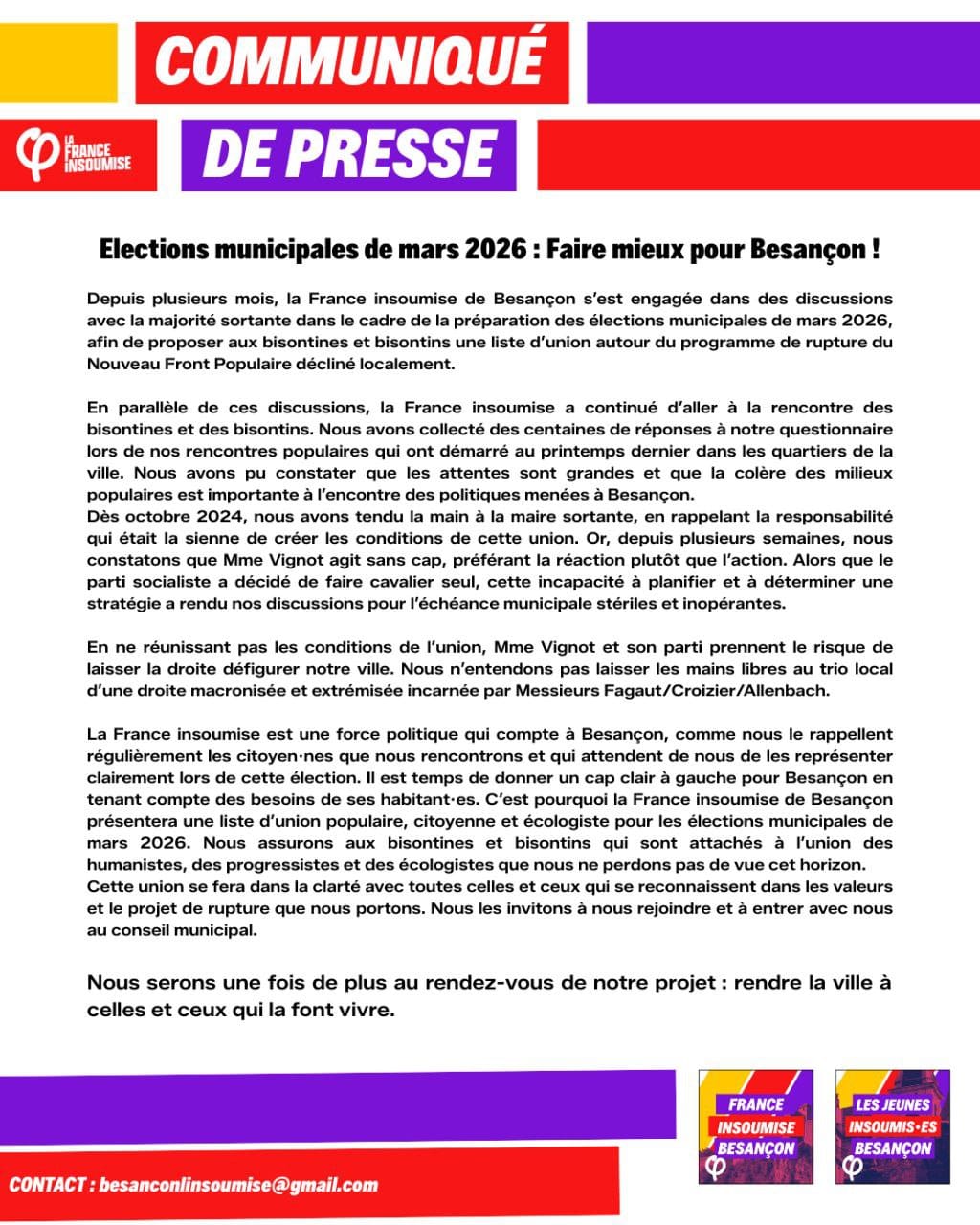 Estimant que le temps est venu pour » donner un cap clair à gauche à Besançon « , La France insoumise » présentera une liste d’union populaire, citoyenne et écologiste pour les élections de mars 2026 « . Toujours avec l’ambition de décliner au niveau local le programme du Nouveau Front Populaire (NFP), né d’une grande union de la gauche aux moments des élections législatives en 2024. Une telle union semble aujourd’hui plus que jamais impossible à Besançon, en vue des futures élections.