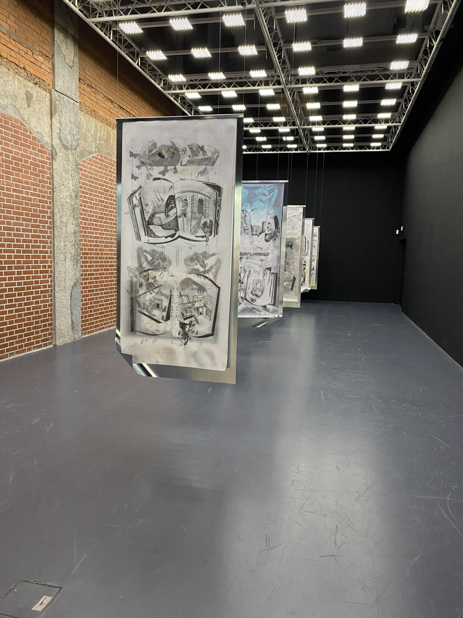 Après plusieurs séjours à Naples pour s’imprégner du lieu, l’artiste a conçu une œuvre singulière : un empilement de feuilles de zinc suspendues, associé à des dessins inspirés de la culture napolitaine réalisés sur papier calque.