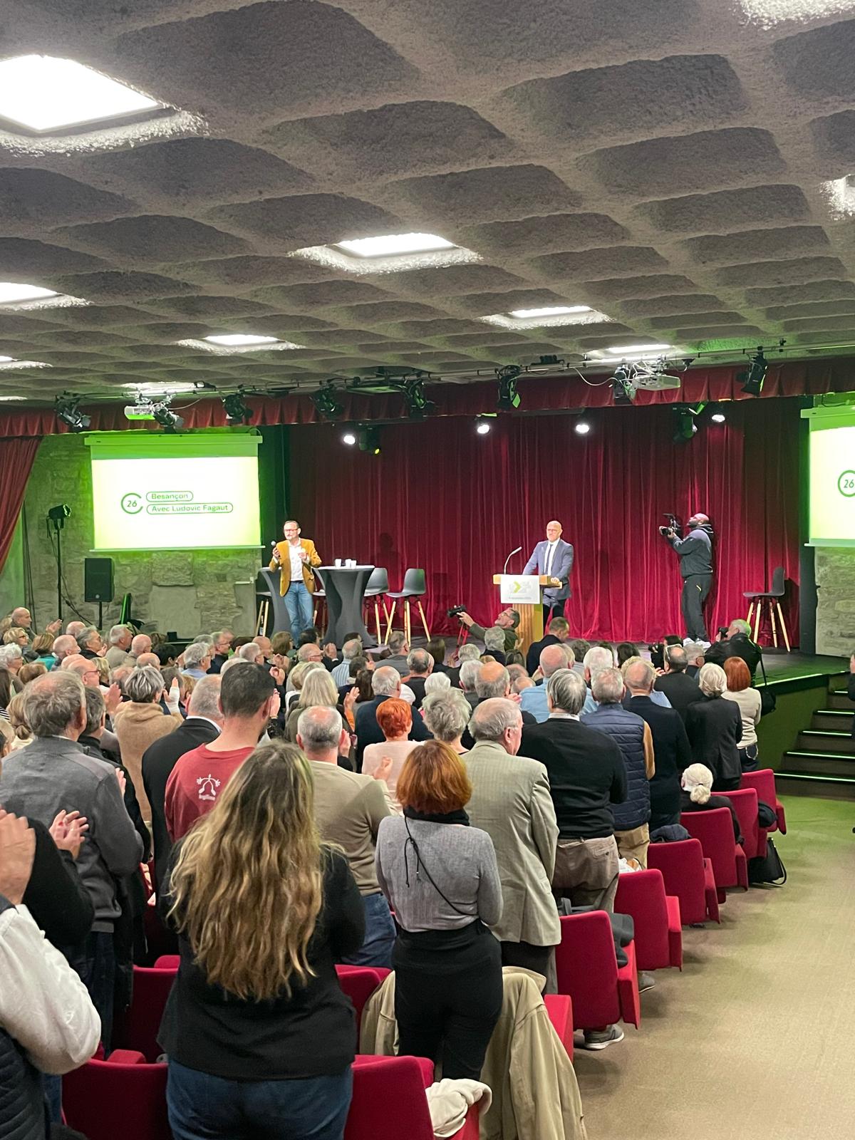 Malgré une préparation minutieusement pensée, l’équipe rapprochée de Ludovic Fagaut (LR) ne cache pas sa joie et son étonnement en découvrant l’accueil réservé au candidat du mouvement Ensemble Besançon Avance pour cette première réunion prévue « sur invitation ». Après l’annonce de sa tenue dans les médias, le rendez-vous s’est finalement transformé en meeting de campagne ouvert au public ou presque et pour le moins attendu : près de 350 Bisontins et Grands Bisontins se sont amassés dans un petit Kursaal plein à craquer. D’autres soutiens ont été réorientés vers la salle Proudhon, prévue pour une retransmission en direct.
