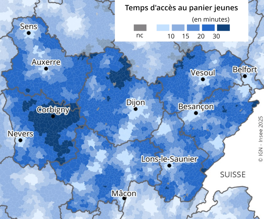 En Bourgogne-Franche-Comté, les jeunes adultes se trouvent en moyenne à 10 minutes en voiture des équipements et services dont ils ont le plus besoin, ceux du panier Jeunes. Par exemple, les agences de proximité de France Travail sont atteignables en 12 minutes en moyenne. C’est pour accéder à un gynécologue que le temps de trajet est le plus long (18 minutes en moyenne).