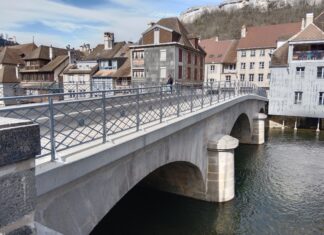 Enjambant la Loue depuis le XVIIe siècle, le pont, de 36 mètres de long et 8 mètres de large avec trois arches en anse...