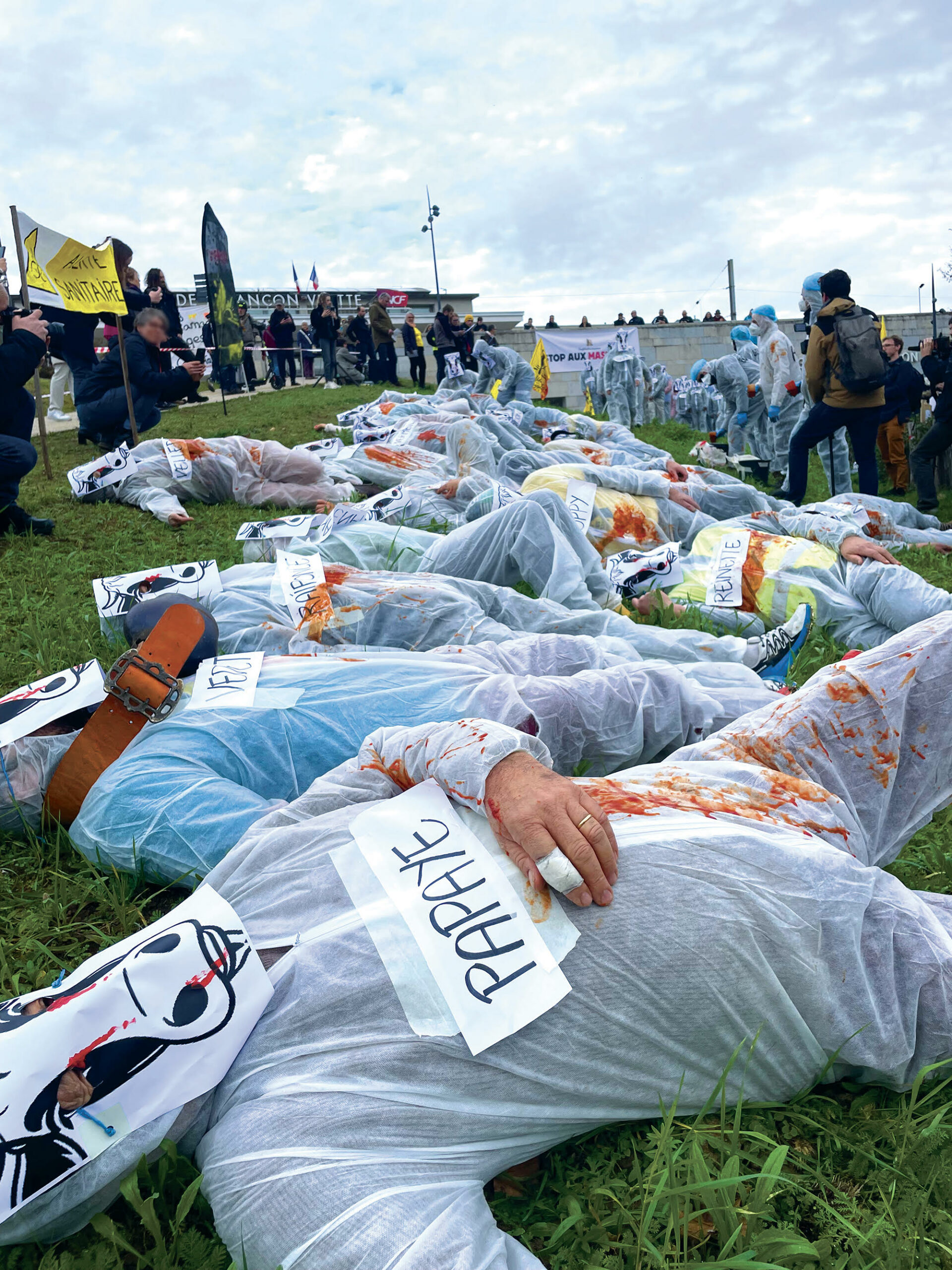 Pour tenter de faire bouger l’État après les cas de Pouilley-Français, environ 300 manifestants et de nombreux tracteurs se réunissent mercredi 10 décembre devant la gare Viotte de Besançon, face aux bureaux des services de l’État en charge de la crise. Sur place, la famille Lhomme, épaulée par la Confédération paysanne et la Coordination rurale, dénonce « ce massacre organisé ». Devant eux, une centaine d’agriculteurs et militants déguisés en vaches portant le nom de chaque bête abattue à Pouilley-Français se couchent au sol après avoir reçu un jet de faux sang, lancé par des blouses blanches incarnant les « bourreaux » : la Chambre d’agriculture, la Commission européenne, Annie Genevard, la FNSEA et la Direction générale de l’alimentation.