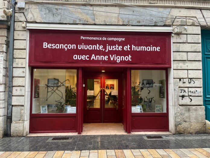 Les candidats aux élections municipales de 2026 entrent dans leurs dernières semaines de campagne et la tension monte encore d’un cran. Ce qui dérive parfois et malheureusement sur des actes malveillants. La maire sortante de Besançon, Anne Vignot, et son équipe « Besançon vivante, juste et humaine » en ont fait les frais le vendredi 30 janvier. Au petit matin, militants et Bisontins ont découvert la façade de la permanence recouverte de tags tels que « Plus jamais PS » ou encore les initiales « PS » (pour Parti socialiste, ndlr), barrées d’une croix noire, comme pour manifester le refus d’une alliance récemment actée avec le parti à la rose. Au-delà de cet acte stupide, ce sont surtout les réactions du monde politique local qui en disent long. Les proches de la candidate écologiste ont d’abord condamné cette dégradation, à l’instar du président de la région Bourgogne-Franche-Comté, Jérôme Durain (PS). Du côté de ses adversaires, le candidat Horizons Éric Delabrousse, malgré une opposition totale sur le plan idéologique, a publiquement condamné « avec la plus grande fermeté ce vandalisme ». Un message conclu par un subtil jeu de mots autour de sa liste « Besançon mérite mieux » : « la démocratie mérite mieux. Et Besançon aussi. Avec un débat digne, respectueux et tourné vers l’avenir de notre ville ».