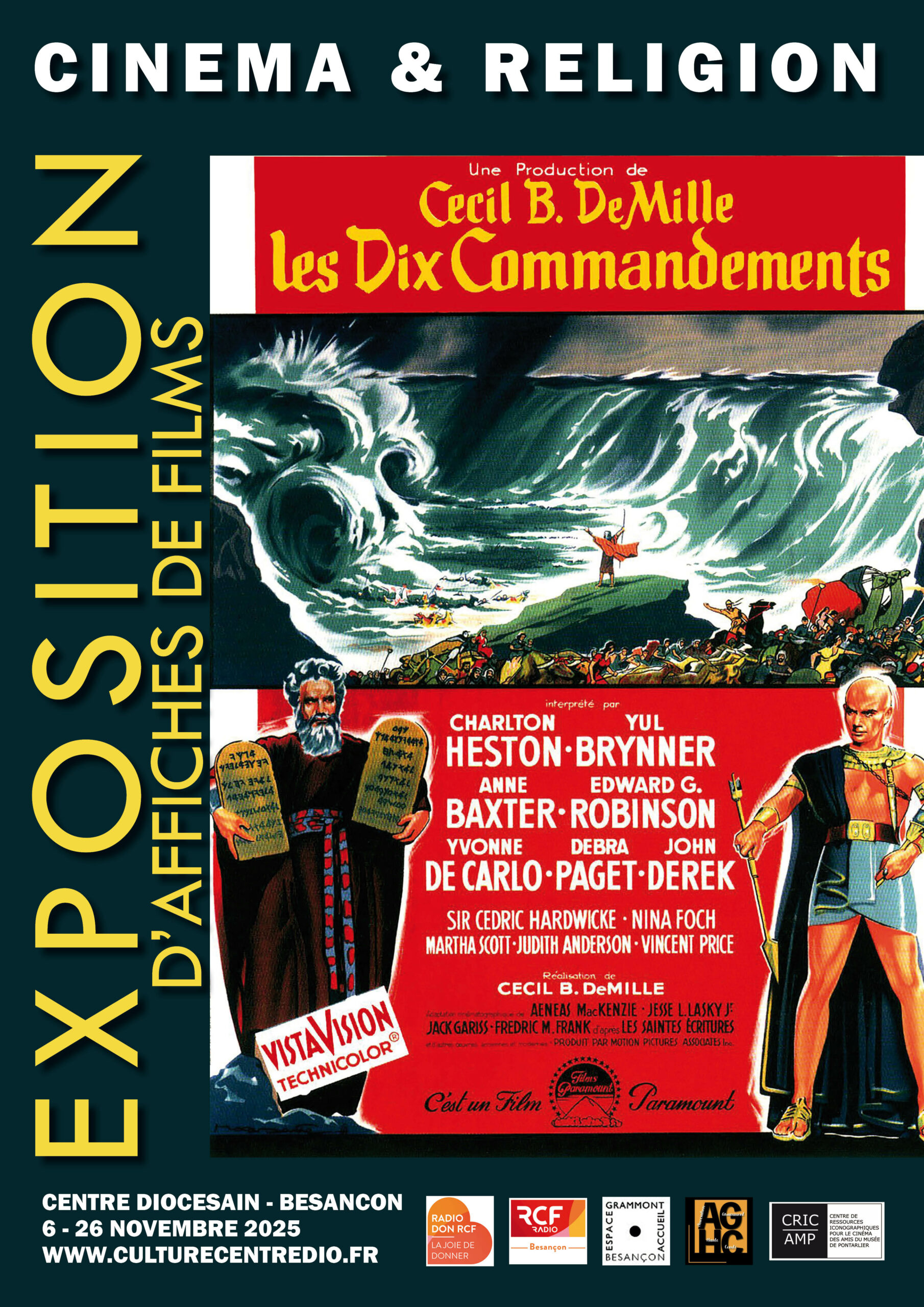 Du 6 au 26 novembre 2025, le Centre diocésain de Besançon, en collaboration avec le Centre de Ressources Iconographiques pour le Cinéma des Amis du Musée de Pontarlier, la radio RCF Besançon et l’Association Grammont Haute Comté, présente une étonnante exposition d’affiches de films sur le thème du « Cinéma et Religion ».