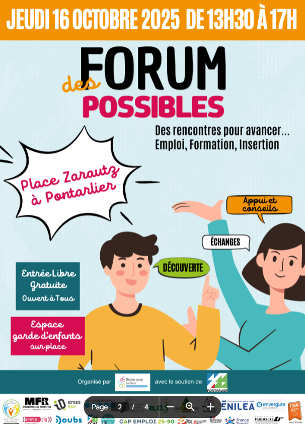 C’est un événement inédit, organisé par la Mission Locale Haut-Doubs en collaboration avec ses partenaires locaux. Le Forum des Possibles, a lieu le 16 octobre de 13h30 à 17h, place Zarautz à Pontarlier, pour faire découvrir des métiers, des secteurs et des parcours inspirants, de mettre en lien les usagers avec des professionnels, associations et structures locales, mais également d’ouvrir le champ des possibles à travers les échanges, témoignages et ateliers. Le Forum s’articule autour de plusieurs espaces complémentaires : des stands thématiques animés par des professionnels et partenaires du territoire, des ateliers interactifs pour expérimenter, identifier des compétences, un espace d’échanges.