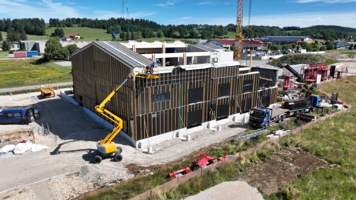 Les travaux ont été lancés en décembre 2024 sur la zone d’activité du Bas de La Chaux au Bélieu, mais une étape majeure a été franchie cet été pour le futur pôle de réemploi et d’économie circulaire avec l’élévation de sa charpente. Le projet, porté par les Communautés de communes du Val de Morteau, du Plateau du Russey et de Préval Haut-Doubs, comprendra une déchetterie, une recyclerie-matériauthèque, et d’un incubateur d’économie circulaire. Sa livraison est espérée pour l’automne 2026. Les trois maîtres d’ouvrage ont une volonté claire : une construction à faible impact carbone et une vision durable du territoire. C’est pour cela que la recyclerie repose sur une structure 100% bois scolyté local, associée à une isolation en paille. « Il était inconcevable en 2018 (pour travailler sur la recyclerie de Maîche, ndlr) de prendre du bois scolyté. Il a fallu se battre. Le projet était tout tracé pour Le Bélieu. Le bois scolyté offre les mêmes caractéristiques mécaniques », explique Claude Gindre, président de Préval Haut-Doubs. 2400 m3 de grumes, soit l’équivalent de 550 arbres en provenance des forêts avoisinantes ont été nécessaires pour produire 590 m3 de bois transformé. Concernant l’isolation des murs et de la toiture, 80 tonnes de paille ont été utilisées, provenant du Jura et de la Saône-et-Loire.