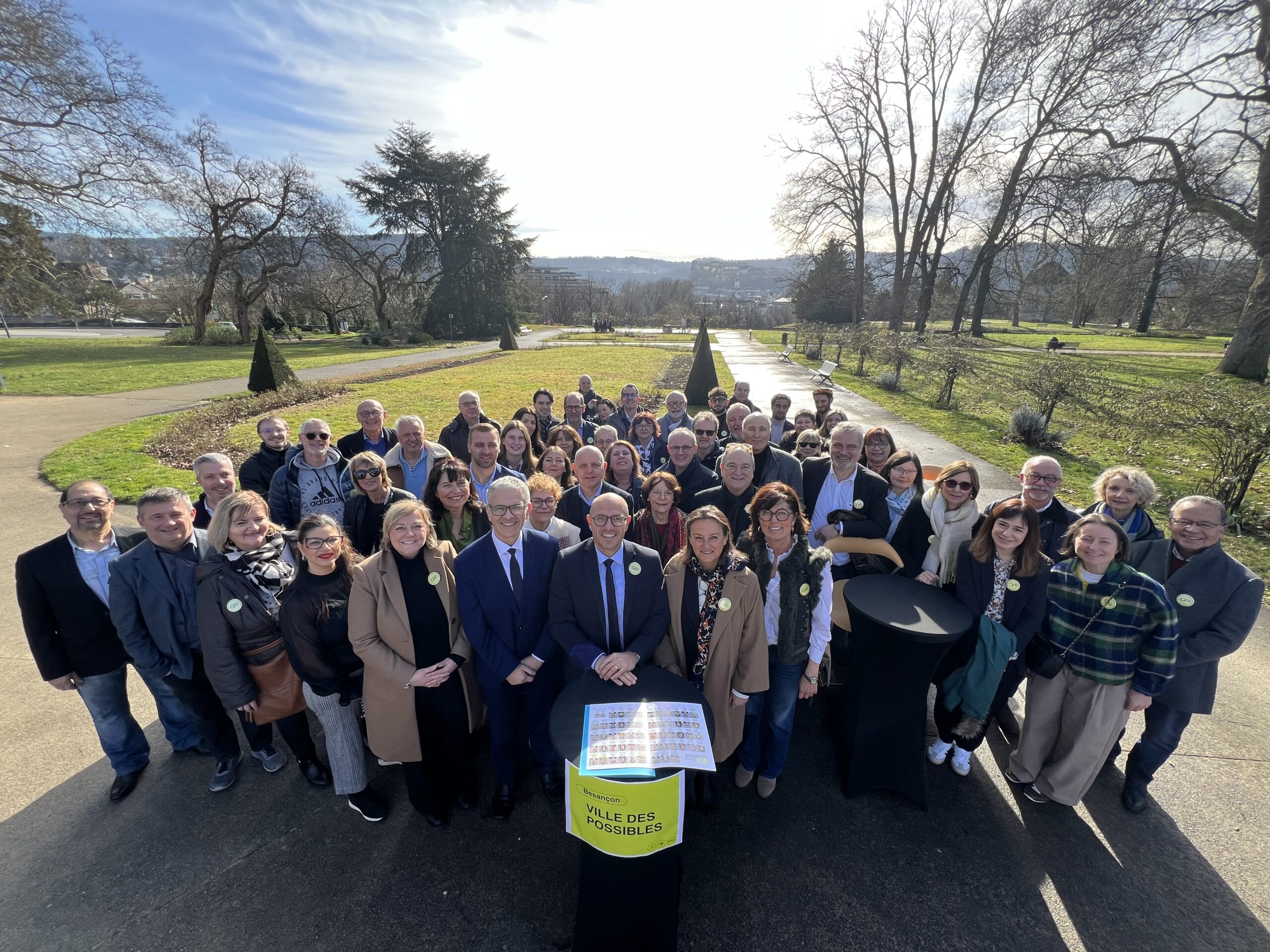Ludovic Fagaut est arrivé en marchant dans le parc des Glacis, suivi d’une troupe compacte composée d’une soixantaine de personnes, chacune arborant le pin’s « Go Ludovic Fagaut ». Sous un soleil radieux, une fois encore, la présentation de la liste complète du mouvement « Ensemble Besançon avance » est millimétrée, ce samedi 7 février. « On aurait pu faire trois listes », assure Ludovic Fagaut, auréolé de 34 % d’intentions de vote au premier tour des élections municipales de mars prochain, selon le dernier sondage de nos confrères de L’Est Républicain, publié deux jours plus tôt.