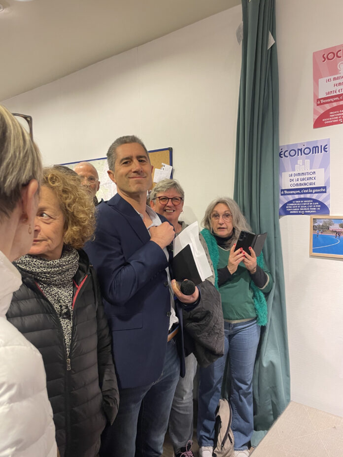 François Ruffin a assuré le spectacle ce mardi 17 mars. Ne dérogeant pas à sa réputation de show-man politique, devant une salle comble et surchauffée, le député du parti « Debout » a galvanisé les militants d’Anne Vignot, en difficulté dans cette campagne. Le local de campagne situé Grande rue, trop exigu pour contenir la foule, a contraint de nombreux sympathisants à rester à l’extérieur. Rappelant l’histoire ouvrière de la capitale comtoise, étroitement liée à son ancrage politique historique à gauche, François Ruffin a lancé : « Dimanche ne rompez-pas le fil de votre histoire ! […] Ne livrez pas la ville à ce qu’il y a de pire, le crypto RN qui divise« .