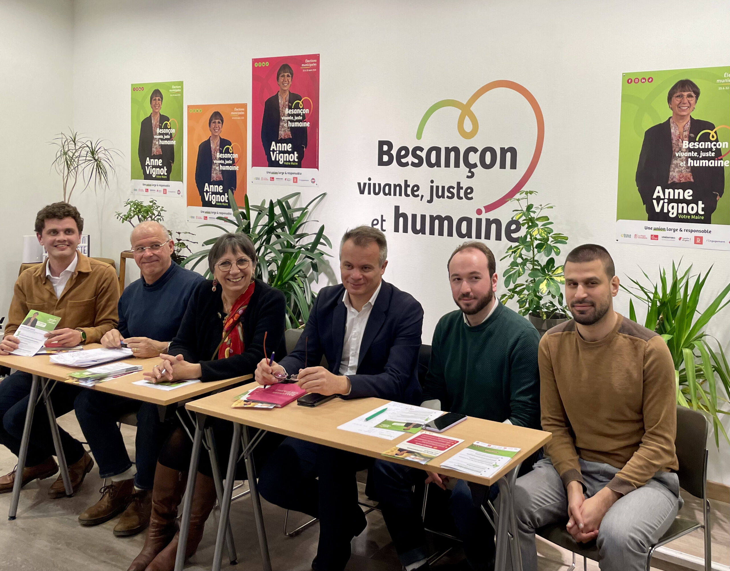 Anne Vignot, maire sortante de Besançon et candidate à sa réélection, a donné sa première conférence de presse, samedi 31 janvier dernier, présentant son programme électoral. La tête de liste de « Besançon vivante, juste et humaine » était entourée des chefs de file des partis de gauche et écologistes : Anthony Poulin (Les Écologistes), Marc Paulin (Debout !), Hasni Alem (PCF), Jean-Sébastien Leuba (Parti socialiste) et Jérémy Jeanvoine (Génération.s). La candidate a ainsi dévoilé la première partie de ses engagements sur le thème de « Besançon vivante ». Quatre axes, déclinés en 22 propositions, mettant en avant « l’écologie, la santé et le savoir-faire local« . Un programme qu’elle qualifie elle-même de « faisable et réaliste« , fruit d’un travail d’écoute et d’échange avec les Bisontins « tout au long de mon mandat ».