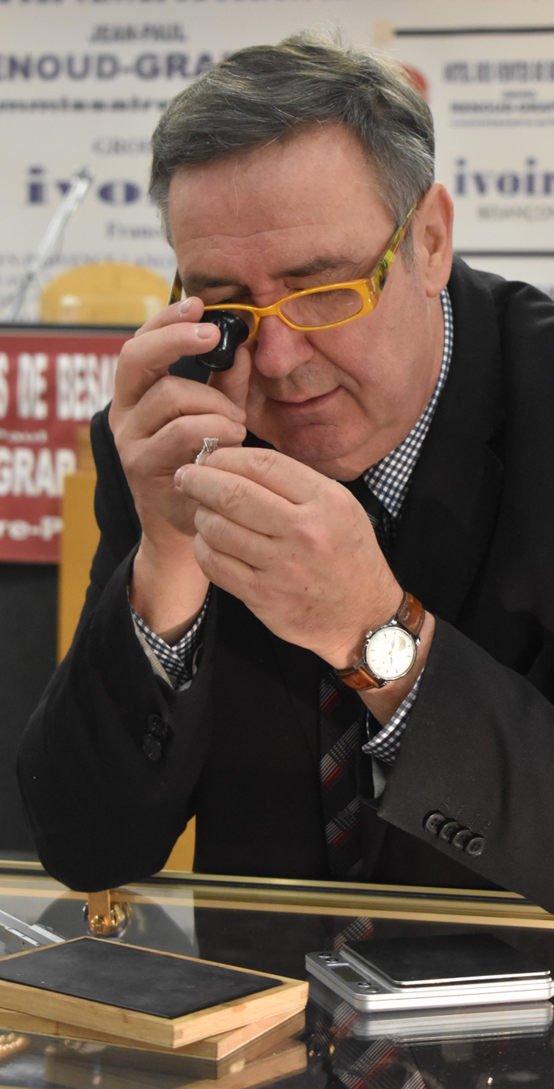 Maître Jean-Paul Renoud-Grappin, Commissaire-priseur à Besançon expertisant une bague. ©Hôtel des Ventes Besançon