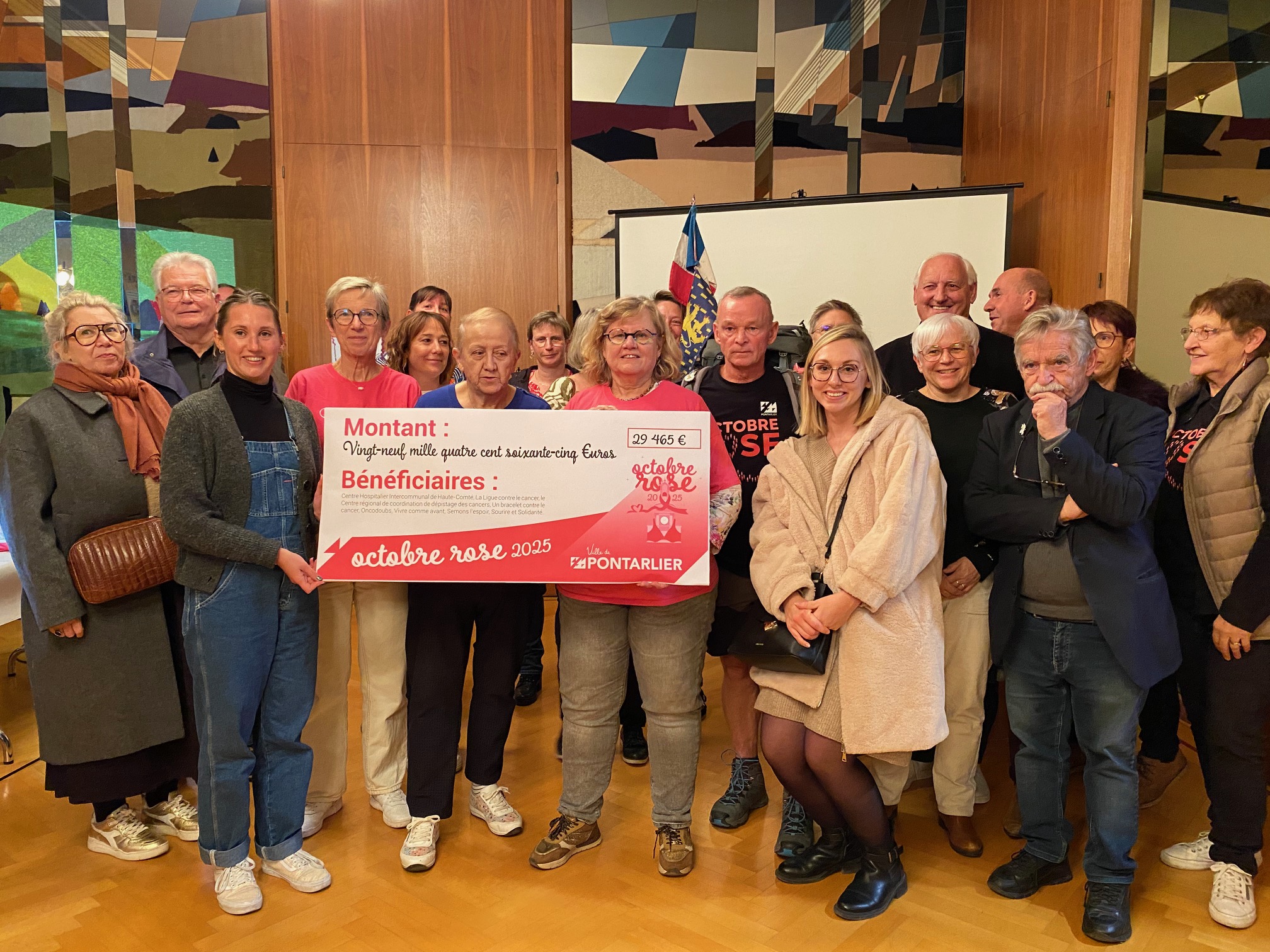Ce mercredi 5 novembre s’est déroulée la soirée de clôture Octobre Rose 2025 à l’Hôtel de Ville de Pontarlier. Pendant tout le mois d’octobre, de nombreux partenaires, clubs sportifs et associations se sont mobilisés à travers exposition, atelier de sensibilisation aux gestes d’autopalpation, rencontres sportives, collecte de cheveux, conférences et bien sûr la Crazy Pink Run le 1er octobre qui a réuni plus de 3 000 personnes. Au total, en comptant la somme récoltée par Dominique Badet, un chèque de 29 465€ a été remis aux huit associations qui œuvrent contre la maladie.