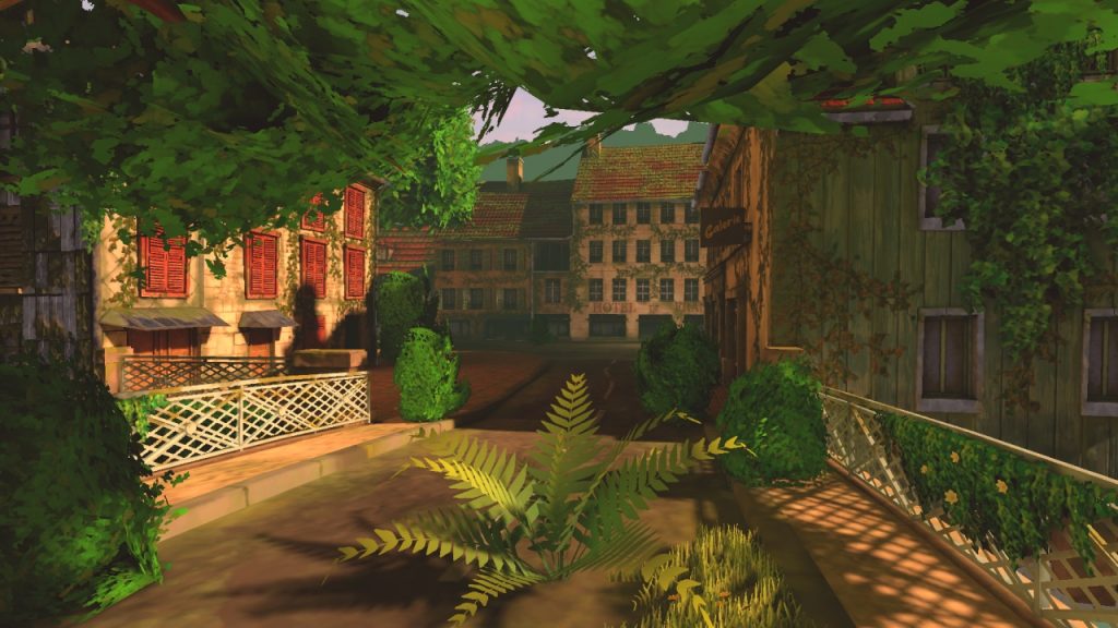 « Autrefois dans la ville d’Ornans, il y avait des truites à profusion…les pêcheurs à la mouche postés sur la passerelle et Gustave Courbet rouspétant après des enfants trop bruyants…Les enfants ont disparu, les truites aussi et la Loue est asséchée par une température de 45° qui déclenche un incendie pour étouffer…Il ne reste qu’à se diriger vers la forêt en suivant un oiseau et un cerf…le sol se dérobe et l’écorce disparaît. La forêt prend place autour de vous. Autour du chêne, l’eau acheminée par les racines vers d’autres arbres qui surgissent face à vous. Vous vous transformez en arbre. Revenu à Ornans, la forêt s’est étendue aux habitations sous l’impulsion de la pluie…les arbres poussent dans les maisons, redessinent les rues et les racines déchirent l’asphalte des routes. Puis la sécheresse laisse place à une ambiance printanière où la rivière coule à nouveau. La ville est devenue forêt. Vous y croisez des cerfs, des renards et des habitants devenus, comme vous, mi-humain, mi-arbre. Un dialogue peut alors s’engager ! »