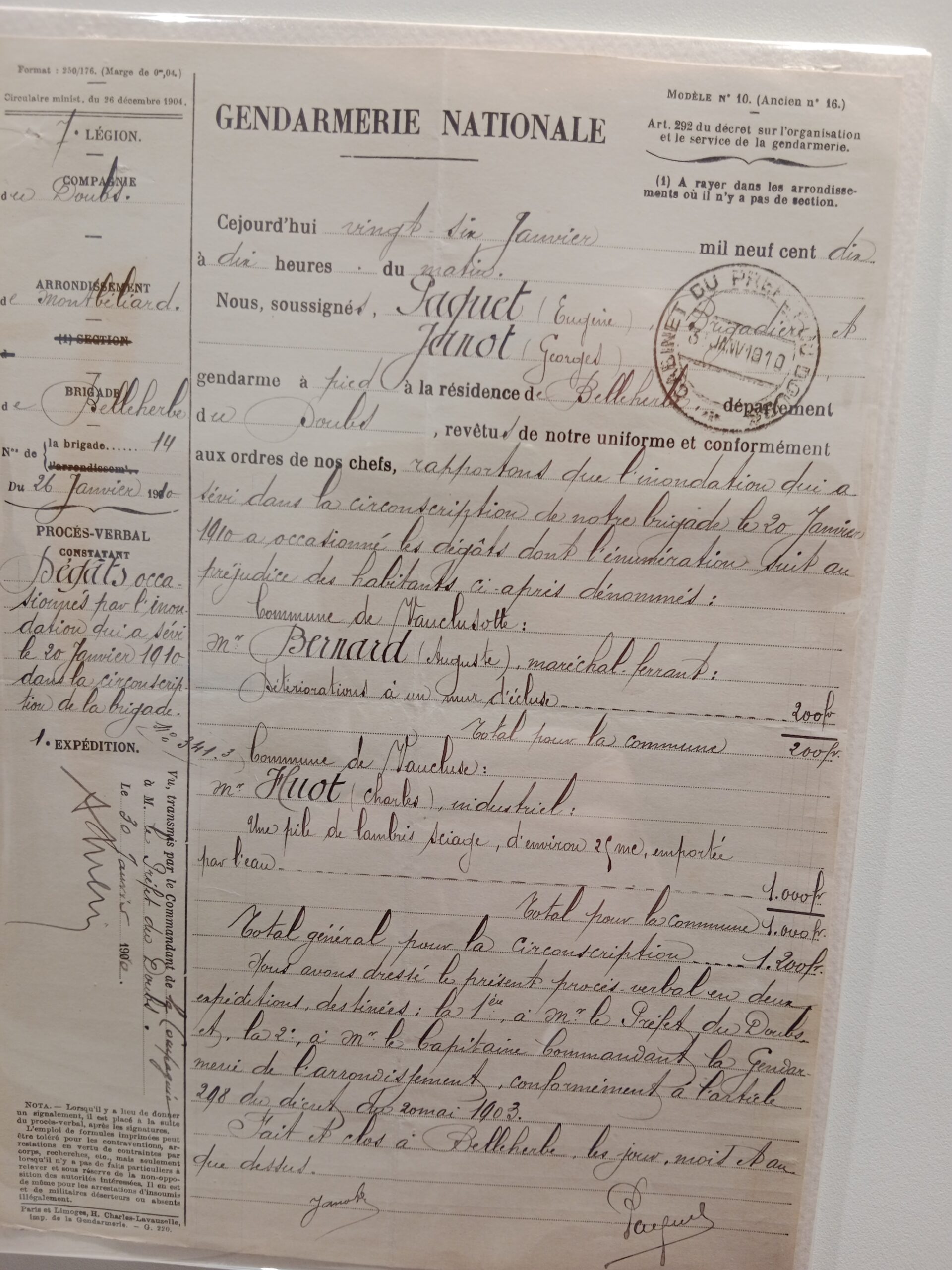 Un arrêté préfectoral du 12 décembre 1907 présenté dans l’exposition, impose un strict respect des rejets d’eaux usées dans les rivières pour la préservation de la ressource…rien n’a changé, notamment dans son article premier. « Il est formellement interdit de laisser écouler…dans les cours d’eau et les canaux du département du Doubs les eaux résiduaires…qui ne seraient pas préalablement neutralisées de toute substance toxique… »