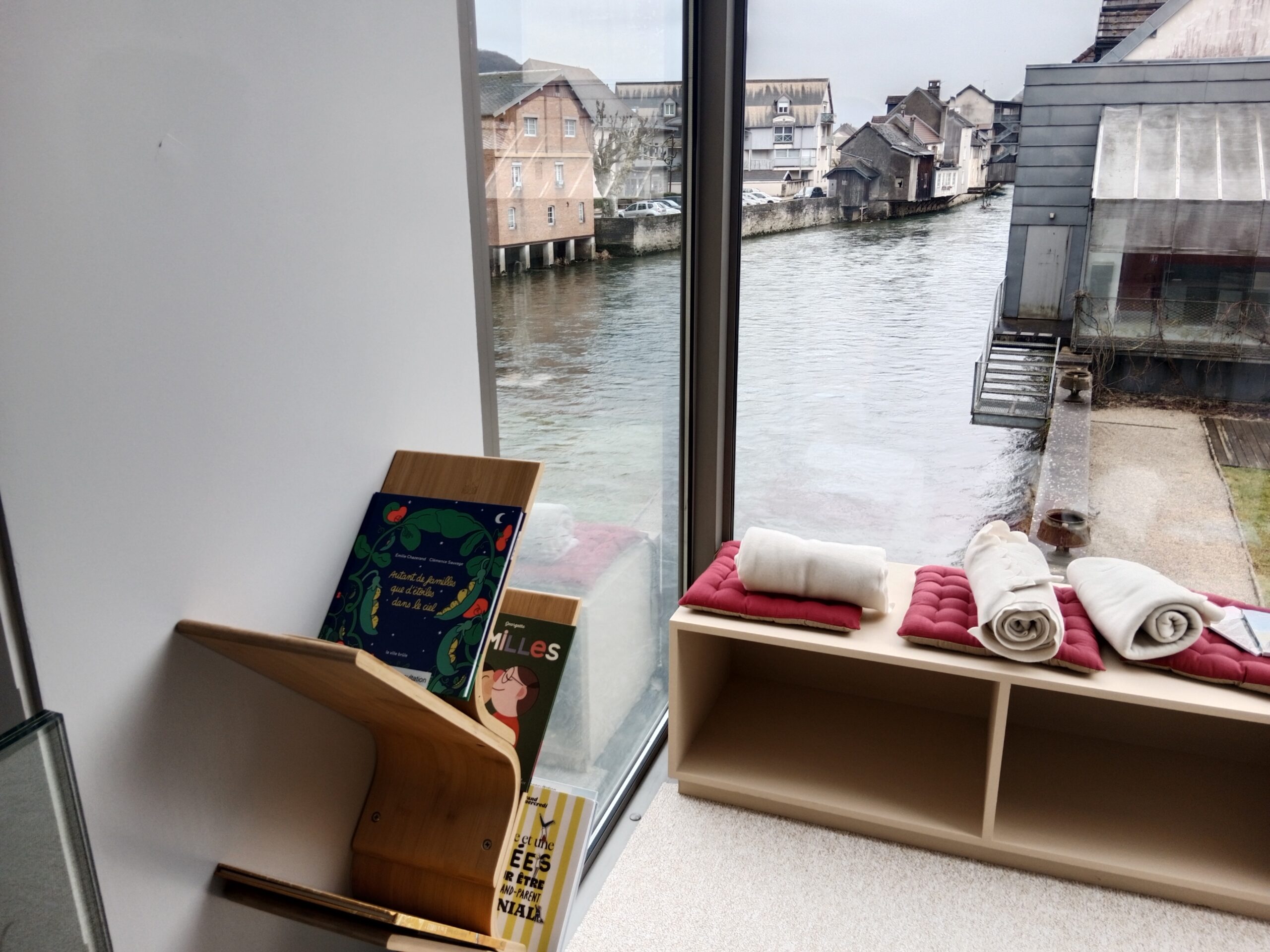 Un espace de lecture a été aménagé sur le long couloir qui surplombe la vallée de la Loue, une façon de prolonger la visite en prenant le temps de la réflexion sur les œuvres à l’aide en particulier d’ouvrages à destination des enfants et des jeunes. Le balcon offre aux visiteurs l’occasion d’une expression collective sur une thématique liée à l’exposition. Chaque semaine, une question différente permet aux visiteurs de partager leurs souvenirs et leurs émotions sur un grand tableau noir…