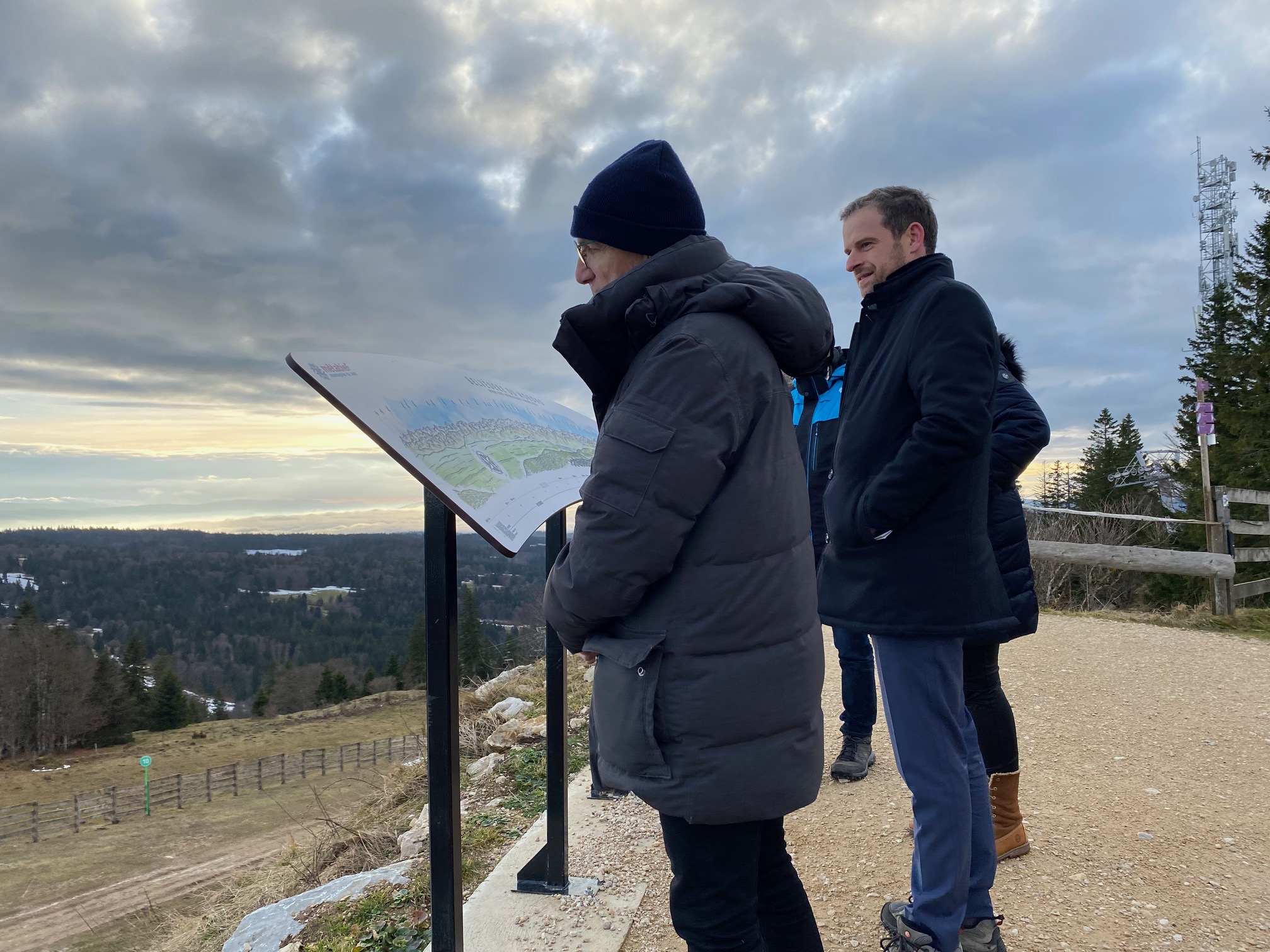 « Prendre le virage en accélérant dans le virage sans sortir de la piste (sic) ». Par ces mots, Guillaume Thiériot, directeur du SMMO, résume la volonté affichée de la station de Métabief au préfet du Doubs Rémi Bastille. Ce dernier est venu visiter officiellement le site ce jeudi 11 décembre. Sur le sommet du Morond, il visualise les différents projets qui sont actuellement menés : l’Espace Naturel Sensible du Mont d’Or, la volonté de créer un « sas » entre le Mont d’Or et le Morond avec des activités ludiques et sportives, les différents équipements installés à l’été 2025.